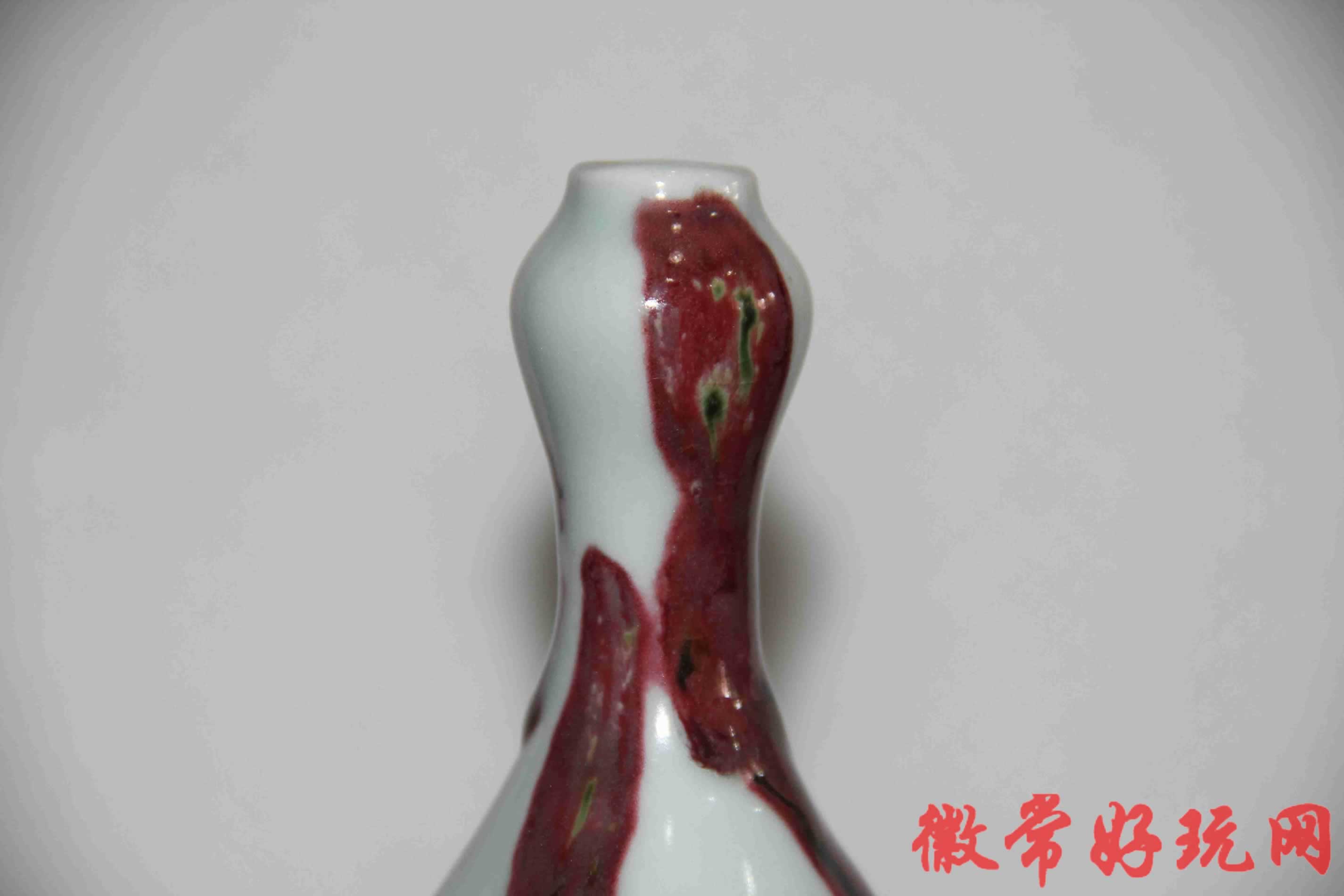 釉里红蒜头瓶,尺寸:高12.5厘米。瓷质坚实厚重、致密,釉色莹润光洁,玻璃质感,成色鲜艳,纹饰清晰。