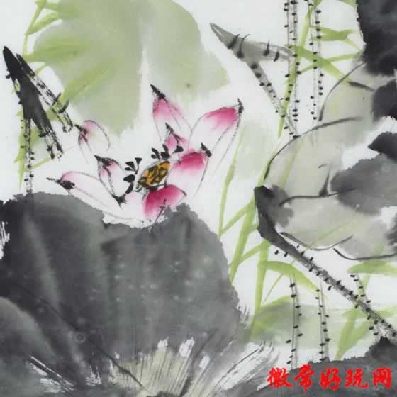 古玩地摊 -> 当代工笔画协会会员卢静《荷香清露图》未托裱