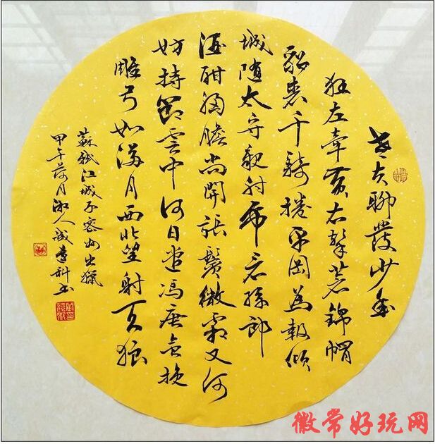 臧远科书法1089行书扇面作品,用洒银富贵黄宣纸书写,规格为66×66厘米,灵动流畅,劲道有力,疏密有序,清爽自然。
