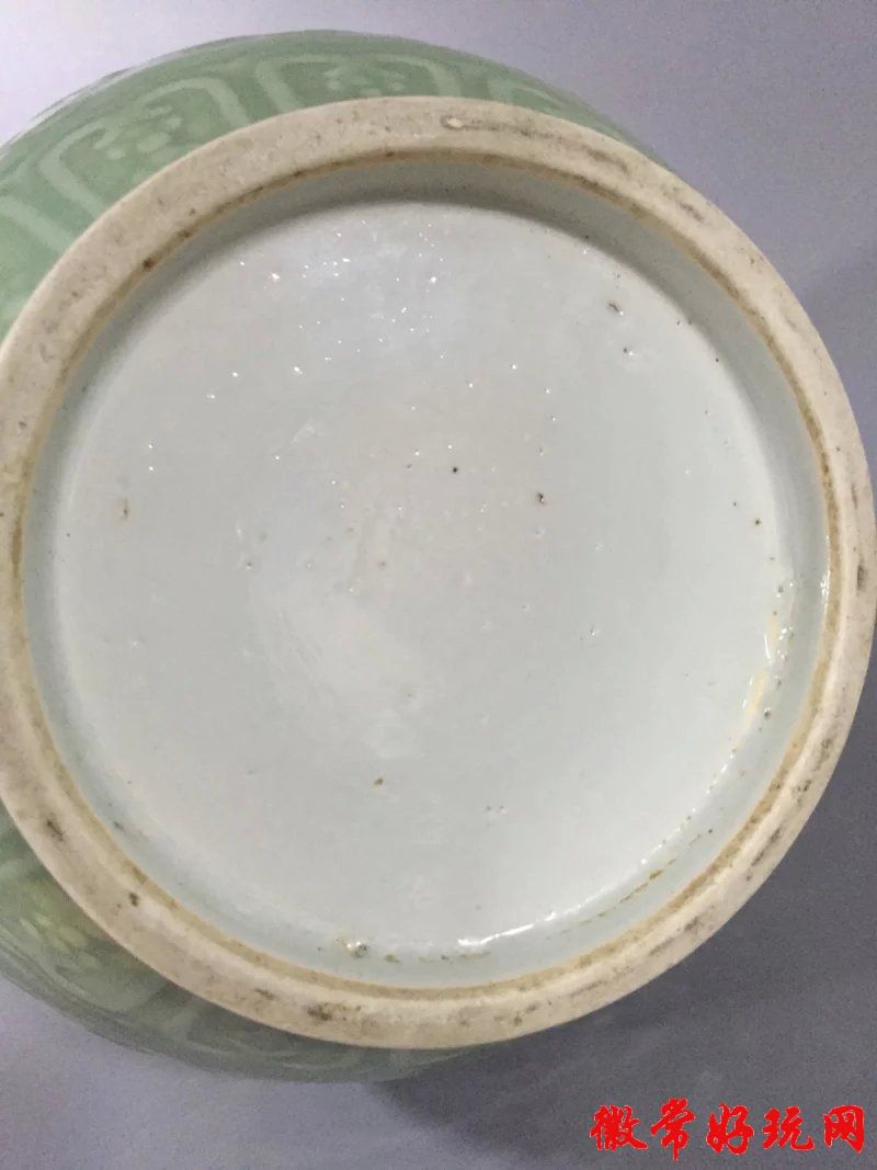 豆青釉,蒜头瓶,缠枝莲刻画瓶,高33厘米,微信电话,13319378519