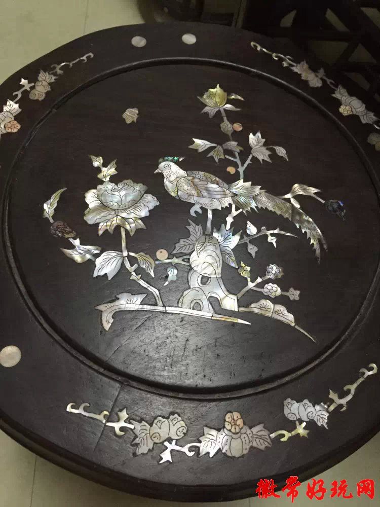 酸枝木.镶贝圆“半”桌(带四张凳子),桌和凳子都是镶贝,非常的漂亮,桌子还可以分开当半桌使用,可当花架,一桌多用,电话号.13319378519