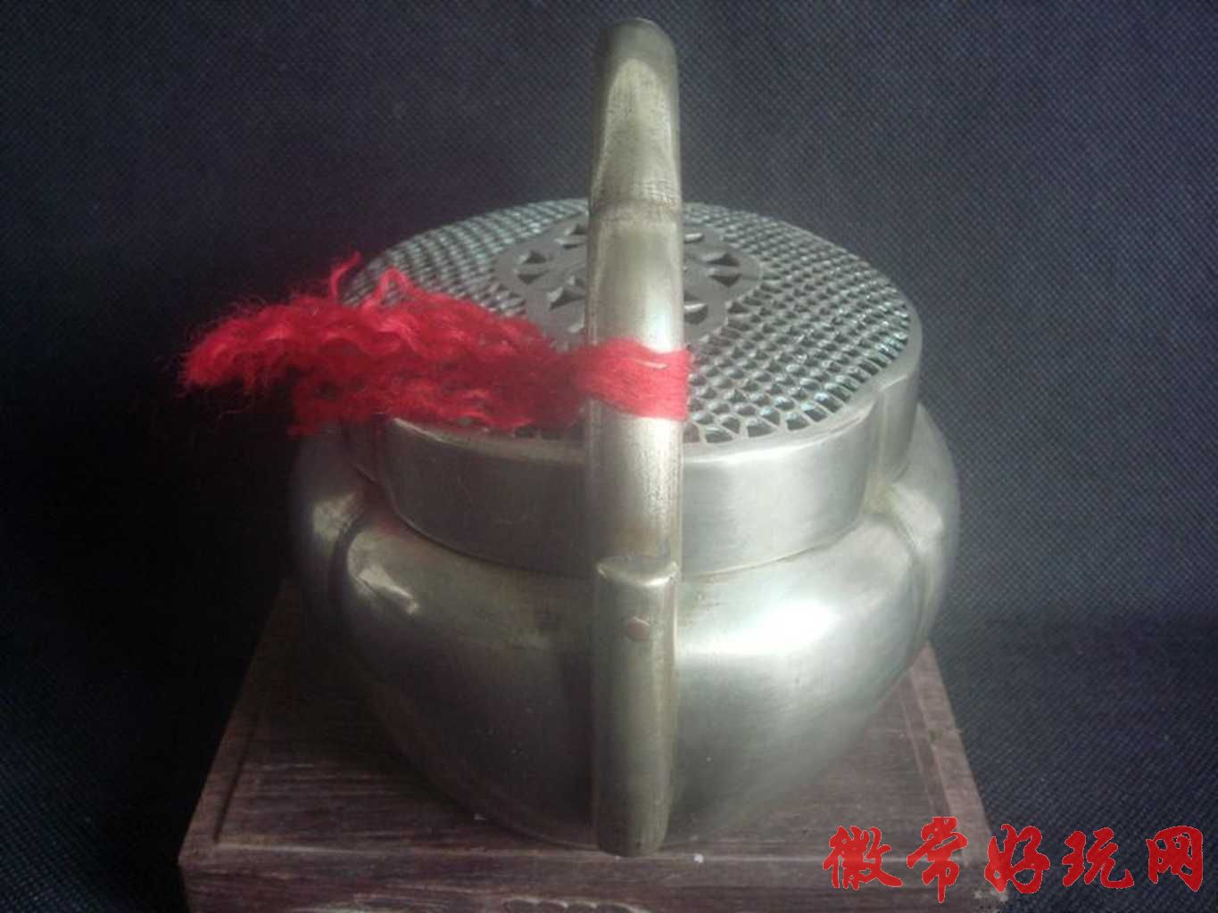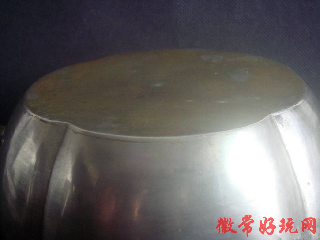 清代白铜椭圆瓜棱手炉。最长处约:15厘米,最宽处约:12.5厘米。底长、宽约:10x8.5厘米。通高约(提梁竖起量)12.7厘米。重约:0.55公斤。提梁呈半园形,铜胎厚实,无修,无裂,基本无瘪痕。炉盖无一根断丝。炉盖紧密,提梁紧密适中,无松动。几乎无瑕疵可挑。基本全品。